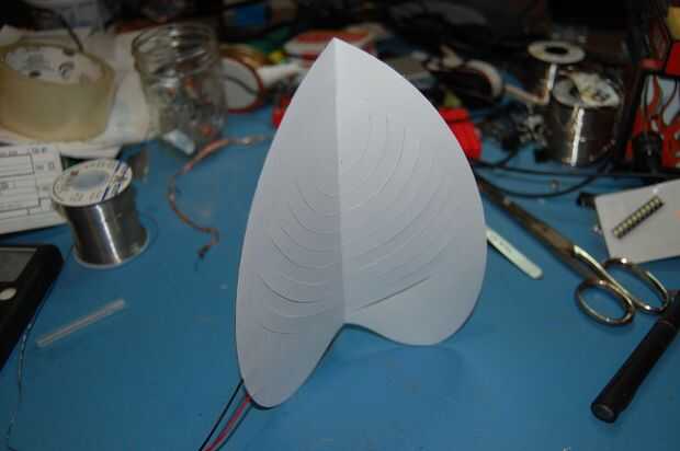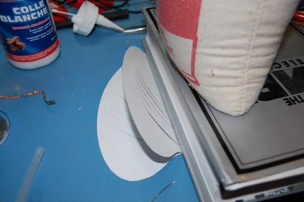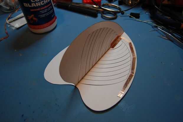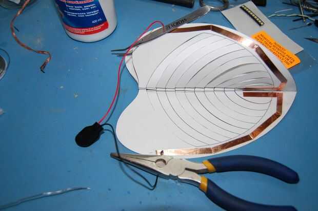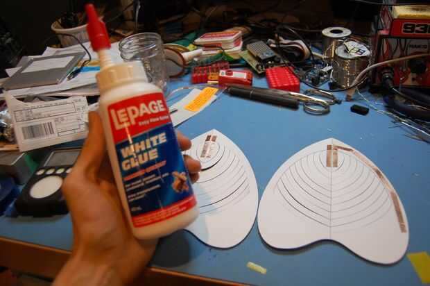 Usando pegamento blanco o una barra de pegamento, aplique el pegamento a una mitad de un lado sin dejar mucho rastro. Encontrar el lado del acoplamiento y péguelos juntos. La alineación es crítica, así que asegúrese de que las dos piezas se alinean correctamente. Usted puede encontrar más fácil para "aplanar" las dos piezas mientras se les pega. Abrazadera de ellos junto con un libro pesado durante unos minutos y cuando seque proceden a pegar el tercer lado. Una vez más, asegúrese de que sólo es aplicar pegamento a las mitades sin dejar mucho rastro. Está bien aplicar pegamento a la hoja de cobre, simplemente no sale nada en la hoja que se extiende hasta las aletas (y donde eventualmente se soldar los LEDs).