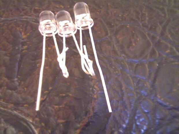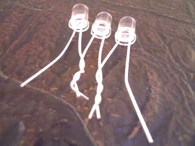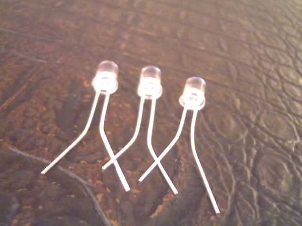 Ahora usted necesita girar los tres LEDs juntos.  Preste atención a que uno es - (negativo) y que es + (positivo).  Luego se curva hacia arriba.
