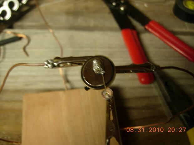 El pequeño trozo de cable al lado positivo de la batería de la soldadura. (Foto 1) Al otro lado del cable al interruptor de la soldadura. (Foto 2) El positivo del LED al otro cable del interruptor de la soldadura. (Foto 3) Suelde el cable negativo del LED al lado negativo de la batería (foto 4)