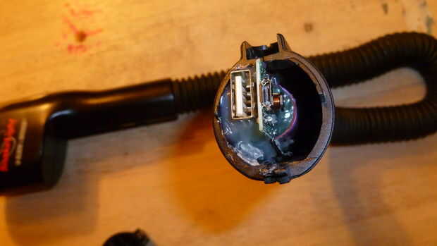 - Coloque la batería dentro del compartimiento de batería. Pongo la parte USB en donde podía tener acceso fácilmente a los puertos y todavía poner la tapa en.