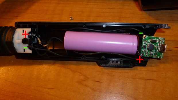 - Soldadura de los cables de la batería lleva el Banco de la energía a la linterna. (Puede ver la resistencia en uno de los extremos). Tenga cuidado de no calentar la batería o el circuito con el hierro.