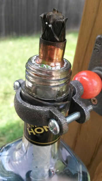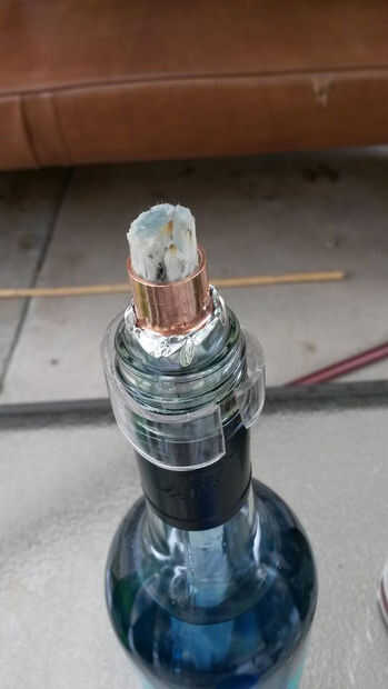 3. Ajuste el acoplamiento de cobre en la boca de la botella. Si es demasiado pequeño, utilice tiras de cinta de aluminio a granel para arriba.
