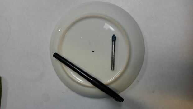 2. comience a taladrar con la broca cerámica siguiendo las indicaciones en el envase. La mina en el fregadero con una tabla pequeña debajo para que yo pudiera enfriar la broca de vez en cuando.