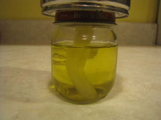 Agarra tu trapo de algodón y corte sobre un 5 pulgadas tira de 1/2 pulgada e hilo de rosca en la jarra tan sobre 1/2 a 1 pulgada cuelga hacia fuera de la tapa y el resto queda en la jarra