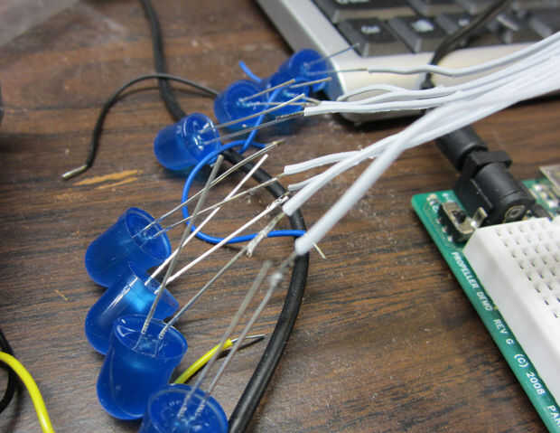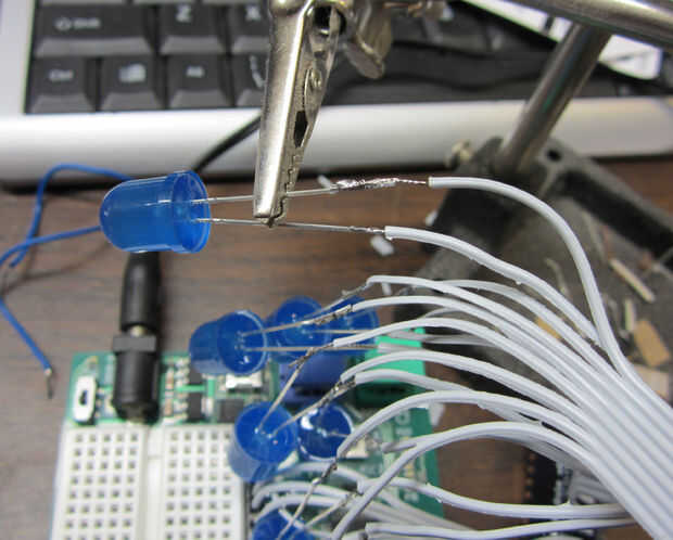 Después de hacer esto, despojado/estaño más alambres para conectar en el lado del ánodo de los LEDs. Después de soldar en, me di cuenta de que porque se trataba de LEDs, tendrían resistencias limitantes actuales para que no sople. Por lo que soldados grande ole' 1 resistencias de k (son tan grandes porque pedí la potencia mal los de un proyecto anterior) a los cables que vienen desde el lado del ánodo de los LEDs. (FOTO 4)