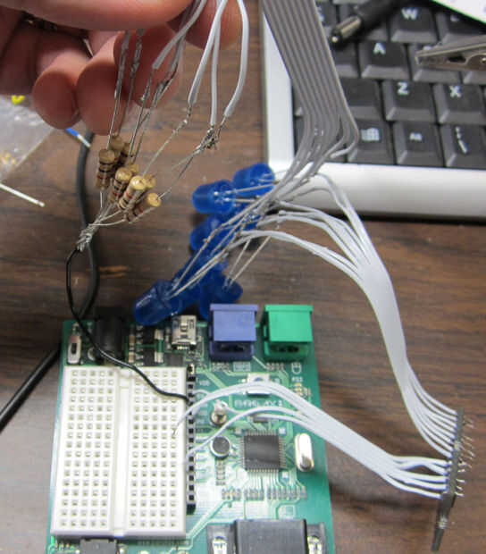 A continuación se que necesitaba añadir los LEDs. Esencialmente en el tablero de NPN8, la fila superior de cabeceras de pins (0-7) conectan a los emisores de los transistores de NPN en la Junta. La fila inferior de los cabezales de perno (0-7) conectarse a los colectores de los transistores de NPN. En transistores NPN, emisores generalmente están conectados a tierra y colectores son generalmente conectados a la alimentación.