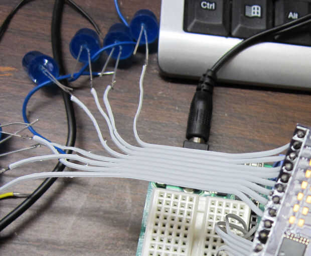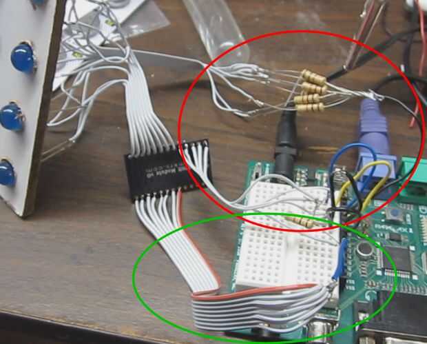 Al otro lado de la Junta de NPN8 (emisor/puerto lateral hacia fuera) va a tierra. Así que de nuevo me pelado hacia fuera los alambres, estañado de ellos y el soldado a la placa. El otro extremo se retorcía. Soldadura fue puesta en el giro, y un alambre era soldado de ese paquete de soldadura de giro a la VDD en el tablero de demostración de la hélice. El círculo rojo muestra los cables que van de los ánodos de los LEDs a VSS y el círculo verde muestra los cables que van desde la Junta de NPN8 a tierra. (FOTO 5)