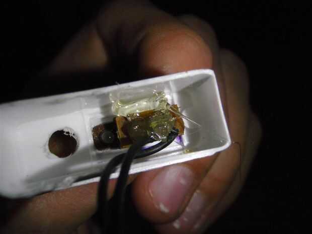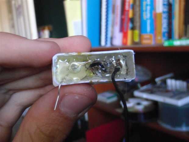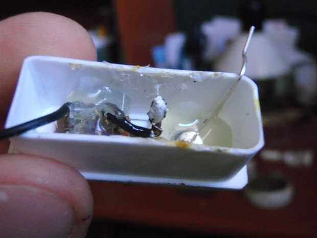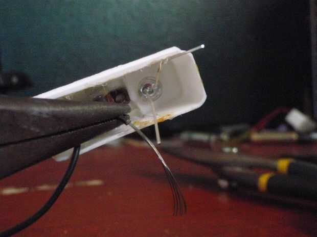 Después de tener un agujero para el LED y el conmutador, es hora de poner. Me di cuenta de que el interruptor no encajan por el agujero del tornillo, así que tuve que cortar utilizando el cortador de alambre. Luego poner súper pegamento [gel] sobre él y ponerla en. Después de que el súper pegamento [gel] había endurecido durante un minuto, fui ahaid y caliente había pegado en agradable y apretado. entonces repetí el proceso para el LED, menos el pegamento. Cuando ambos estaban en, me desnudó uno de los cables al interruptor y soldar uno de los cables de lo LED que. Después de que fuera cool, recorta la parte sobrante empujado completamente hacia abajo en la tapa y llena la tapa casi la totalidad de la forma de pegamento caliente (dejar aproximadamente 1/4 de pulgada de espacio).