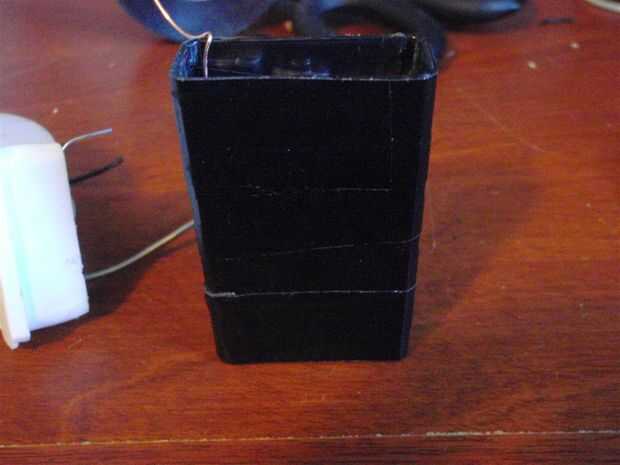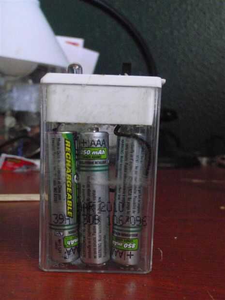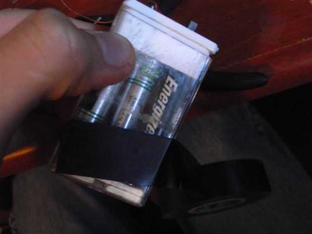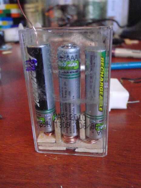 También había despojado de aproximadamente 6 pulgadas de alambre y en espiral un extremo de un polo positivo de una de las baterías para sentarse en y, debido a la altura diferencial, tuvo que poner otro palito por debajo de ella. Luego lo pongo en uno de los puntos laterales para una batería de sentarse (ver foto). Poner pegamento por debajo de todas las cosas de metal y había asegurado en.