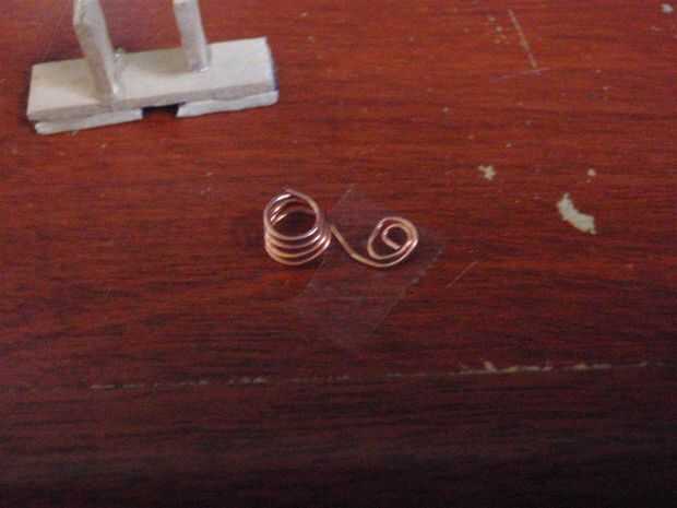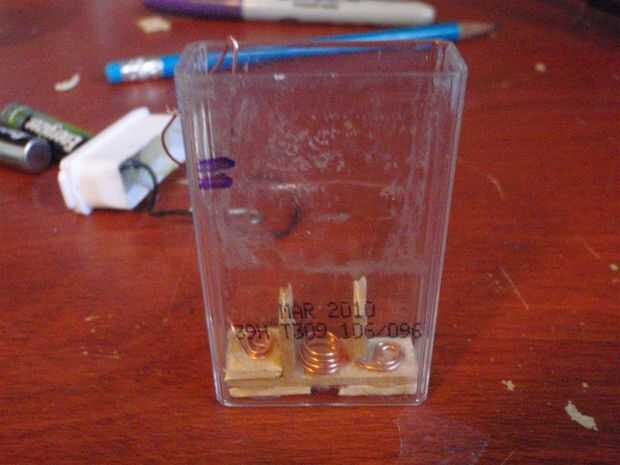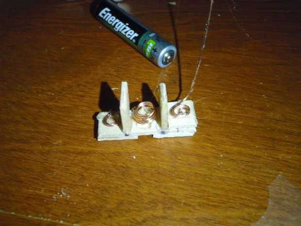 Tiene aproximadamente siete pulgadas de alambre y había lo había despojado a y luego en espiral sobre todo alrededor de la punta de un lápiz para crear un muelle para la terminal negativa de una de las pilas en. En espiral el resto alrededor de un lápiz diferente y gallina aplanado la bobina para el terminal positivo de una de las baterías para sentarse.