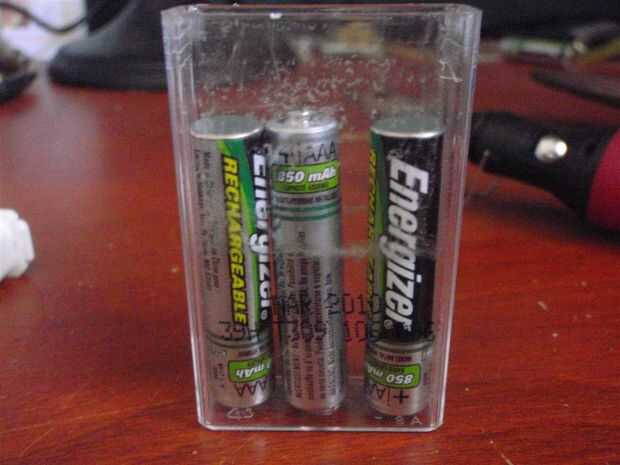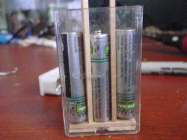 Usted notará que las baterías tienen espacio de holgura a cada lado de ellos cuando se está sentado en el envase. Rectificarlo poniendo palitos entre las pilas. Pero entonces no había suficiente espacio, por lo que los había recortada a 1/3 de pulgada. hay una ligera muesca en uno de ellos, que se utilizará para conectar dos de las baterías entre sí.