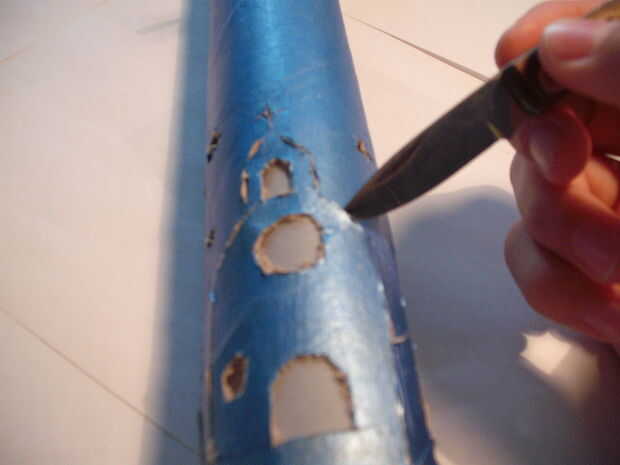 en primer lugar, dibujar el diseño sobre el tubo para que sepas lo que tu hacer, entonces simplemente corte a lo largo de las líneas, (hacer los cortes de 1 mm de ancho para que las líneas son visibles). Recuerde, si usted decide ir a por un paisaje de la ciudad deja un cartón en las esquinas de los edificios, de lo contrario sus edificios caerán!