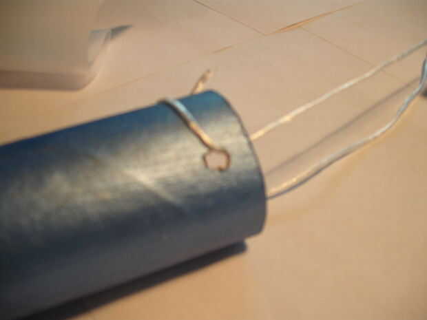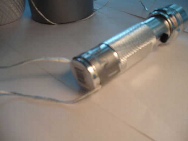 llevar su linterna y realizar dos agujeros paralelos, alrededor de 1 cm de la parte superior del tubo, entonces la cadena y corte 2 bits idénticamente largos apagado, mina fueron unos 15 cm, y pégalos en la parte inferior de la linterna con alguna cinta adhesiva para que queden exactamente enfrente de la otra. poner la luz del flash en el tubo y enrosque las cuerdas que justo pegado en los agujeros hechos en la linterna. una vez que usted tira de ellas a través de todo el camino, hacer un nudo en la p por lo que se puede colgar la lámpara brillante fresca,