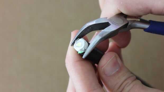 Una vez que el LED esté en su lugar, usted está listo para conectar los cables. Línea de dos hilos con el apropiado conduce del LED. Envuelva la parte expuesta del cable alrededor de los conductores. Luego use un par de alicates para doblar las puntas de abajo a los lados de la varilla. Esto ayudará a mantener en su lugar.