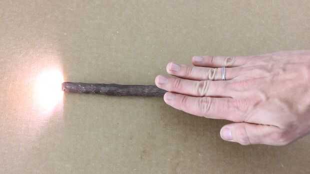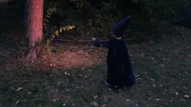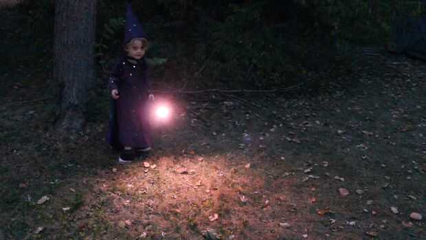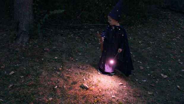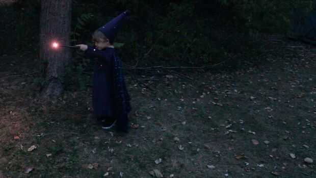 Ahora cuando escoge la varita y sostenga el mango al lado del imán, la varita se ilumina luz magia. Para probar correctamente la varita, le di a mi hijo para usar con su traje de mago para Halloween.