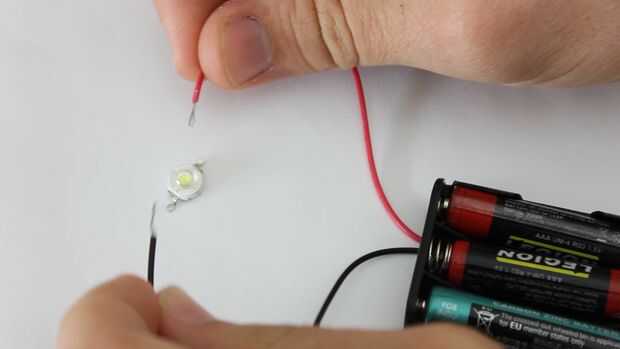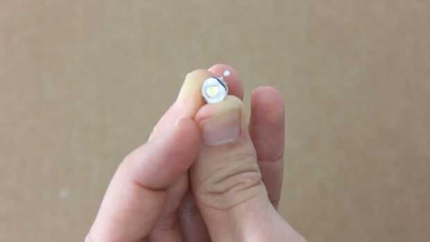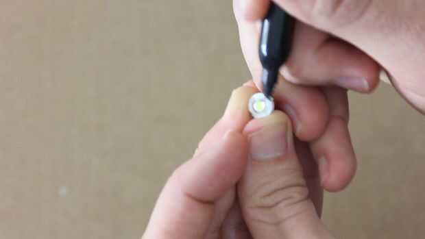 A continuación deberá marcar la polaridad de lo LED para ayudarle a hacer un seguimiento de qué lado es el cátodo (negativo de plomo) y que es el ánodo (positivo). La forma más sencilla de hacerlo es tomar un paquete de baterías (con el mismo voltaje que la linterna) y apenas toque los cables de salida a los cables del LED. Si se enciende, entonces sabes que tienes la polaridad correcta. Para conmemorar esto, me llevó un sharpie y dibujó una línea negra en el lado negativo (el cátodo).