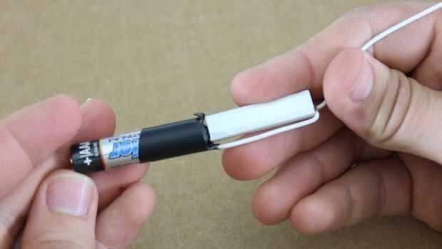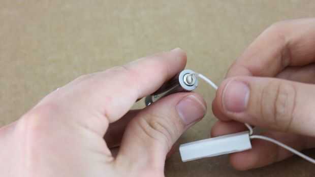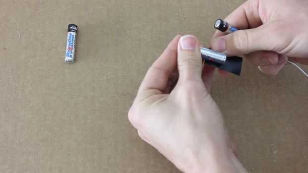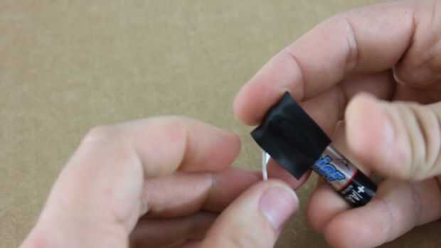 La sección expuesta del cable corto y rizo en forma de bucle. Luego utilizando un trozo de cinta aislante, cinta adhesiva hacia abajo firmemente en el extremo negativo de una de las pilas AAA.