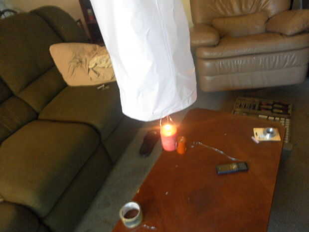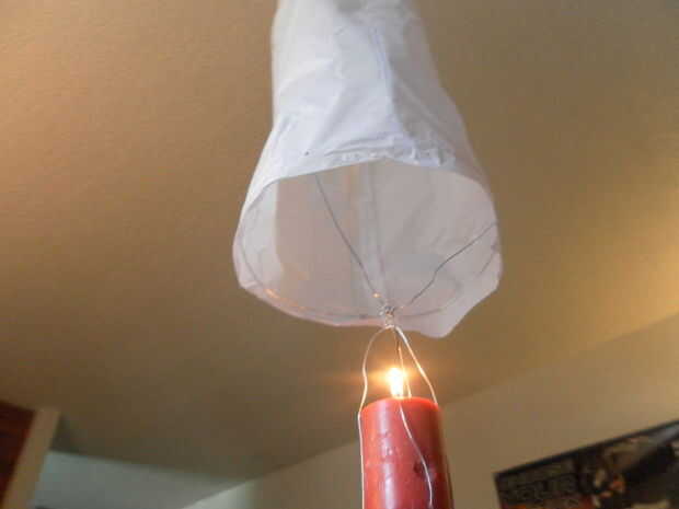 Para mi proyecto he utilizado productos que estaban disponibles para mí. Así que en lugar de usar papel de arroz y bambú. Usé papel de seda (que usted vería en regalos), y una muy pequeña medida alambre que tenía puesta alrededor de la casa. Lo único que compré fue cinta transparente y dos velas de tamaño diferentes para mi célula de combustible. Comencé haciendo un marco de alambre para incluir el papel de tejido alrededor, suavemente con cinta el papel firmemente alrededor el marco que su no fueron agujeros para el calor se escape. Entonces se coloca una pieza redonda adicional de papel de tejido en la parte superior para que el aire caliente atrapado. Por último, hice un soporte de alambre para asegurar la pequeña vela en su lugar justo debajo de una abertura del círculo. Después de encender la vela no tarda más de tres minutos para que la linterna del cielo comenzar el levantamiento. :) Yo tenía un montón de diversión en este proyecto y espero que a. Muchas gracias