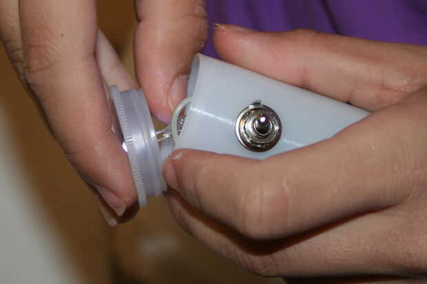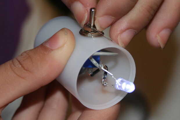 Caliente (actualmente usamos una pistola de pegamento de baja Temp.) de pegamento los cables expuestos pero no pegar al lado de la lata o no puede cerrar la tapa. Los alambres que sobresalen.