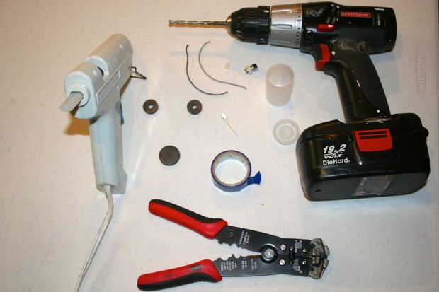Pila de 3 voltios (no foto) Imanes de 1 a 3 (depende de tu método) 2 cables (de color diferente y cinco pulgadas de largo) Taladro Cinta aislante Cartucho de película Pegamento caliente LED Soporte LED Interruptor (no mostrado) Cortadores de alambre