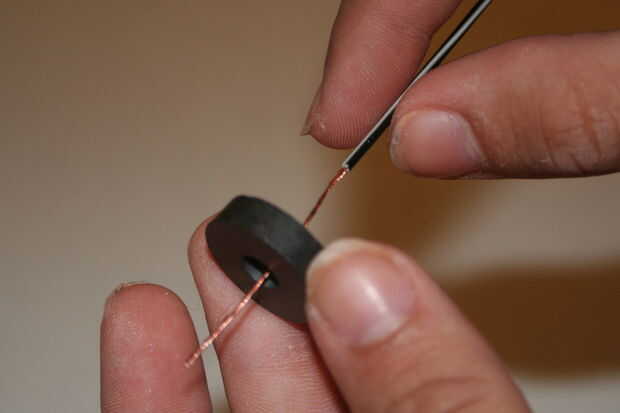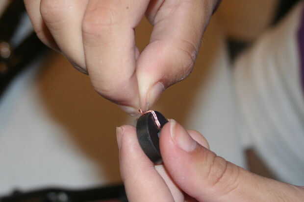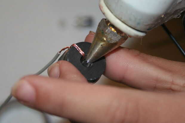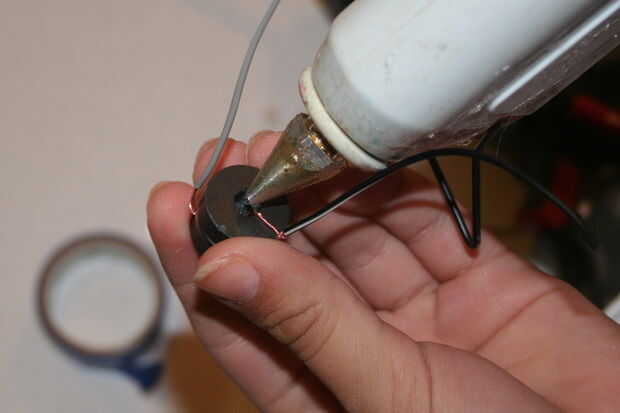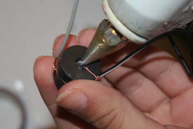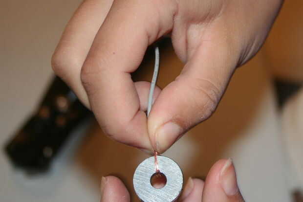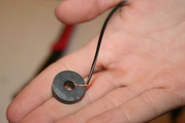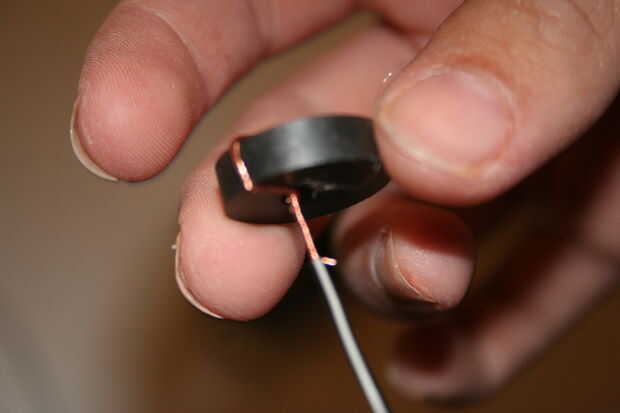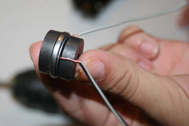 Enrolle el cable alrededor del imán o el imán si tuya no tiene agujeros en él. Hacer esto para ambos cables.