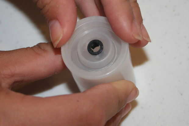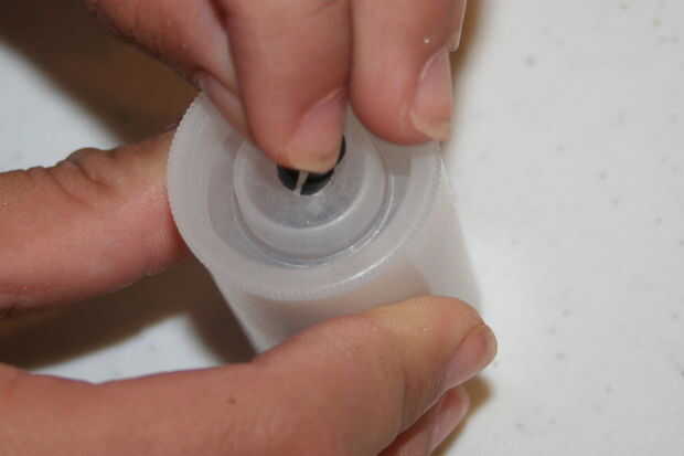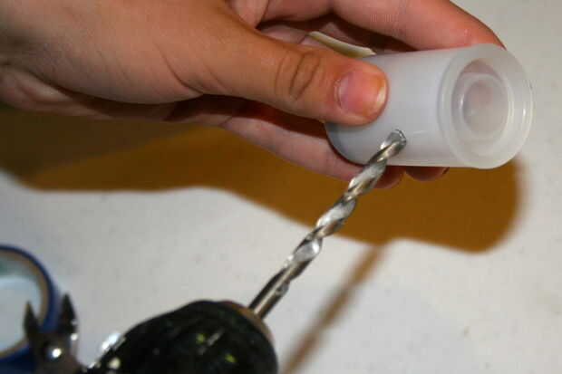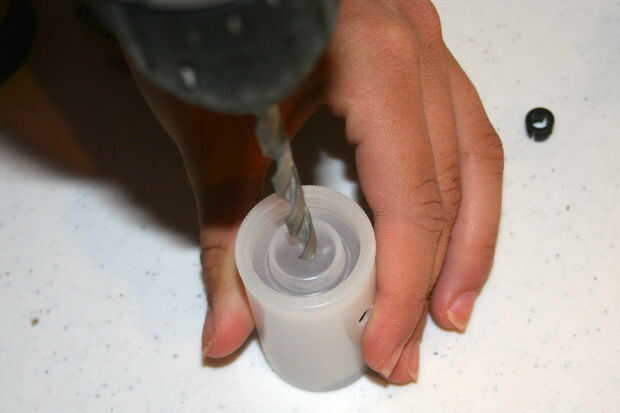 Perfore otro agujero en la tapa de la lata. Era más fácil tener la tapa en el recipiente durante la perforación. Este agujero es para el soporte de LED. Encontramos que era una buena idea hacer un agujero en la tapa con un clavo y luego perforar. La broca debe ser del tamaño adecuado para el soporte de LED. Mejor empezar un poco más pequeños y trabajar hacia un mayor agujero hasta que el soporte encaje.