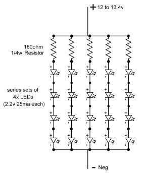 La soldadura de las series de 4 LEDs juntos. Solde un resistor en el lado positivo de cada sistema. Recomiendo probar cada sistema con una fuente de alimentación batería o variable para confirmar que tienes en las orientaciones correctas. Si el LED está conectado en orientación inversa ese conjunto particular no se enciende.