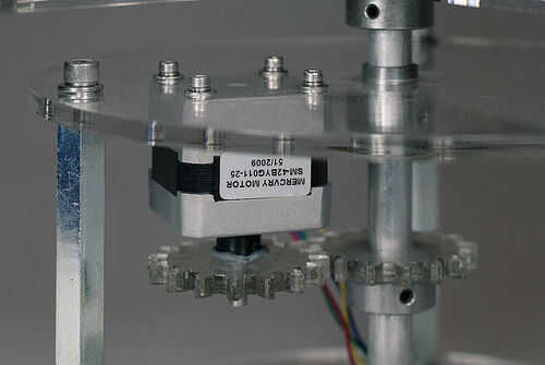 Quite los tornillos que sujetan el motor. Utilice los tornillos más largos de la M3 de la lista de compras para montar el motor de la parte posterior, en la parte inferior del disco superior. Bocadillo un M3 arandela y arandela con cada tornillo.