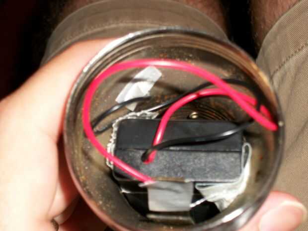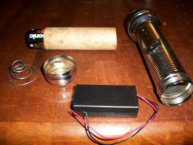 La siguiente modificación que hice fue a las baterías. Encontré una caja de la batería AA ahí. El caso era un ajuste perfecto para el caso de la linterna. Resbaló en apretado. He añadido alguna cinta a él para hace el ajuste un poco más y luego alguna cinta se puso en dos esquina, lado pegajoso hacia afuera para mantener las baterías en su lugar. Fue grabado el cable negativo al caso y el positivo fue grabado para el conector en el reflector. (Esta linterna es metal. Fijar el cable al caso no funcionará si la linterna que está utilizando no es metal.) Usé papel de aluminio para cualquier área donde la conexión no era escaso. Una vez que se hicieron las conexiones, he probado la linterna y funcionó muy bien. He probado estas conexiones antes para asegurarse de que se trabajó.