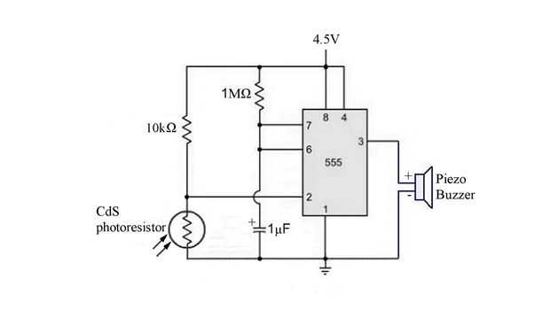 Hay una gran variedad de los fotorresistores CdS y las tolerancias de fabricación varían violentamente. El que usé tenía un rango de 3KΩ cuando bien iluminado a 30KΩ al oscuro. Dependiendo de la fotorresistencia que utilizas, puede que necesite cambiar el valor de la resistencia entre los pines 2 y 4 (resistencia de 10KΩ). Para activar el temporizador, este resistor debe tener una resistencia al menos dos veces más grande que la fotorresistencia cuando está iluminado. Ajuste el valor de esta resistencia también cambiará cómo de sensible es el sensor. Recomiendo probar varios valores antes de soldar el circuito juntos.
