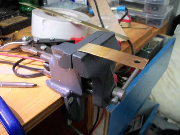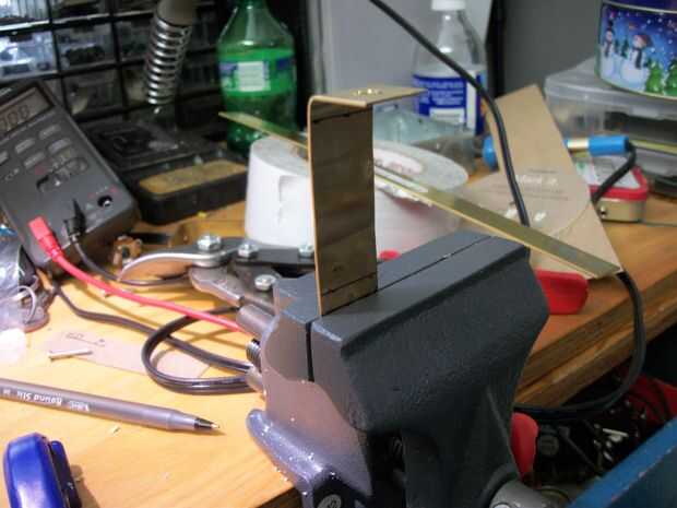Las tiras de cobre amarillo de la abrazadera en el tornillo de banco y dóblelos a 90 grados. Intente su mejor para hacer de esta una curva recta, mientras que aceptan que sin las herramientas adecuadas para el trabajo del metal de hoja, esto es poco probable que suceda. Pero que está bien, porque estamos trabajando con bastante descuidados espacios aquí de todos modos, por lo que nada tiene que ser perfecto.