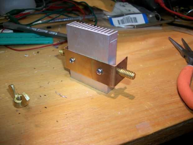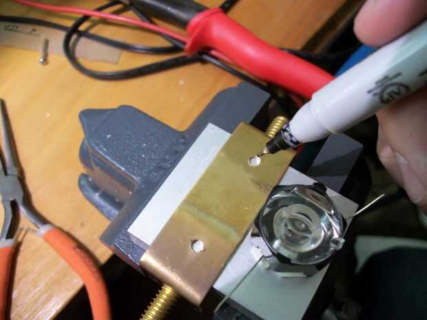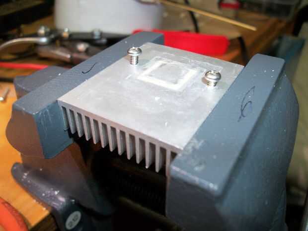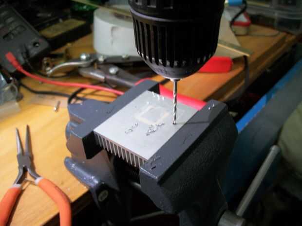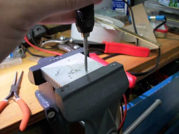 Ahora, localizar donde deben los agujeros en el disipador de calor. En mi caso, decidí montar un poco la luz en la parte superior y atornille el soporte sobre el punto de grasa donde estaba el viejo chipset puente sur. Averiguar donde debe ir, entonces marque el punto y taladro. Esto sería un buen momento para obtener el conjunto de luz y lentes y utilizarlos para la colocación. Fui poco dos tamaños más pequeños que mi grifo porque el aluminio es blando como la mantequilla, por lo que es mejor hacer cosas apretadas.