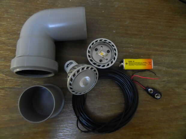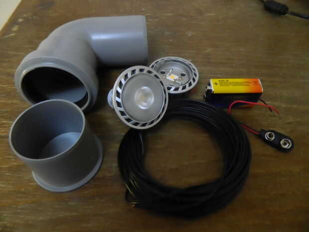 Simple tubo de PVC. El mío es un 50 mm de ancho y tiene una curva de 90 grados en ella.
