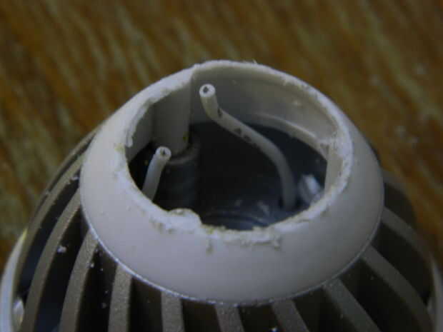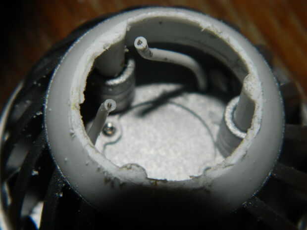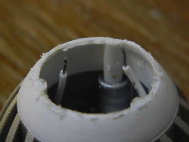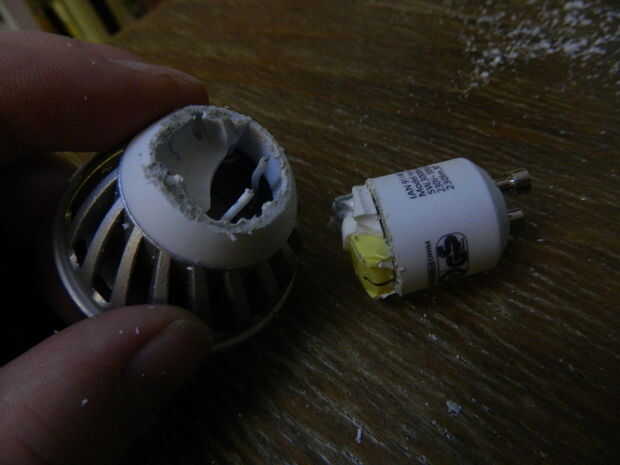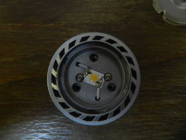 Existe un pequeño LED de SMD, 2 cables y un transformador en el final. Todas las piezas de aluminio funcionan como un disipador de calor.