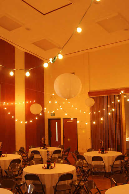 para mi boda tuvimos una boda con temática japonesa. para la iluminación teníamos linternas y cuerdas de luces. Los faroles colgados en cuerdas que colgamos de un extremo del techo a la otra, y hubo cerca de 3 faroles en cada cadena. Luego colgamos las secuencias de luces la manera opuesta, a lo largo de las cuerdas.