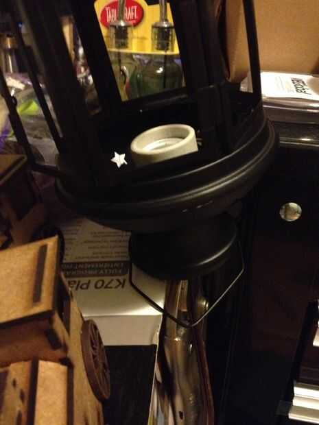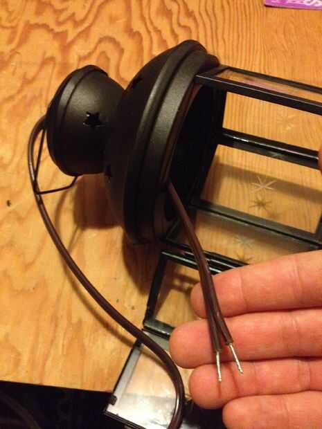 Ahora que tienes el cristal es removido (ignorar el primer vaso de cuadros), sostenedor del tealight quitado, agujero en la parte superior, pase el cable por el orificio, a través de un niple y tuerca de seguridad y conectar a la toma.