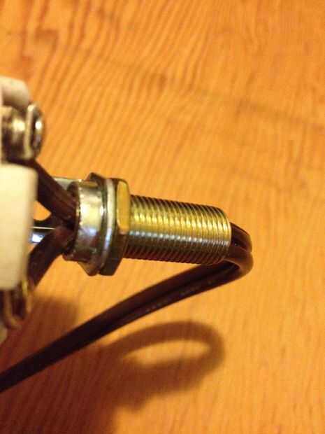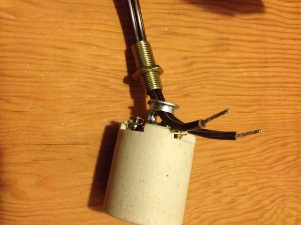 Una vez que todo está conectado y apretado, asegurando que cables desnudos no se toquen, atornille el niple en la base de enchufe y apriete con la tuerca de seguridad. Ahora tire del cable de la lámpara hasta que el ensamble es presionado contra la cubierta de la lámpara. Usé un agarre del tornillo de banco muy poco mantener el cable en su lugar mientras que invertido.