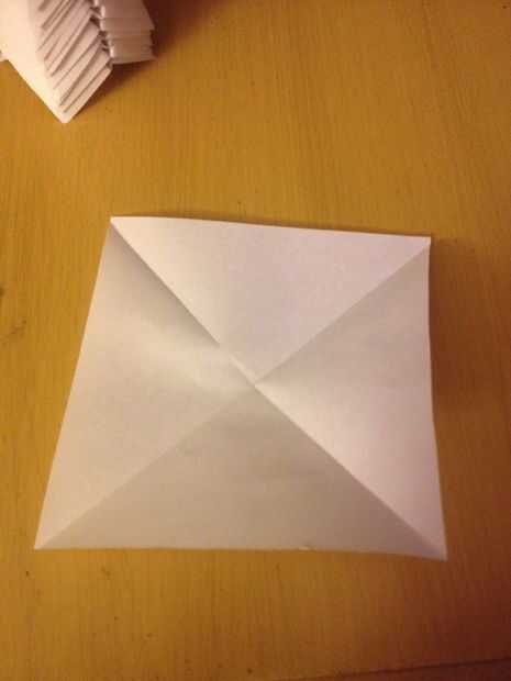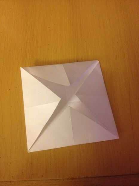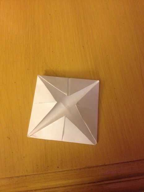 a continuación tomamos una de nuestras plazas y pliegue a lo largo de dos diagonales. Entonces nos doble las esquinas hacia el centro. Siguiente paso muy importante es voltear todo, luego te retiras simplemente todos los rincones nuevo.