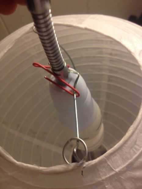 Una vez que su acabado pegado en su adivinación 125, es el momento de montarlo en el artefacto. Si usted quiere utilizarlo como una pantalla para una lámpara usted puede montarlo en cualquier manera que se pueda imaginar o si desea utilizar un extensor de zócalo como lo hice desde el techo, se puede usar un clip de papel! Todo lo que tienes que hacer es doblar el clip de papel por la mitad y ambos lados del gancho del cable de la lámpara como se muestra en las fotos.