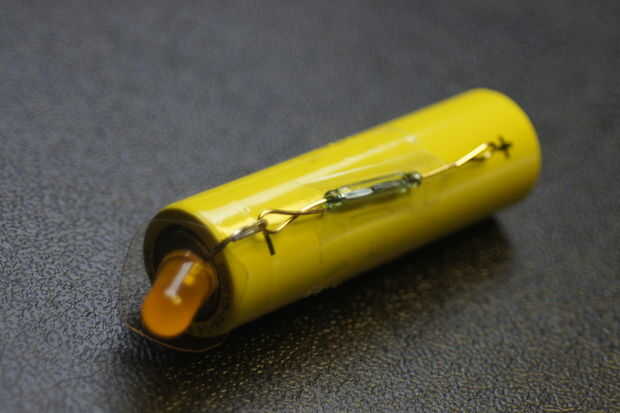 • El interruptor de láminas, en una de las baterías en forma de cinta la las cañas en su interior están en la batería y el LED va a tocar el lado negativo de la batería con su cátodo (espiral).