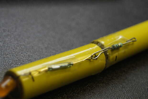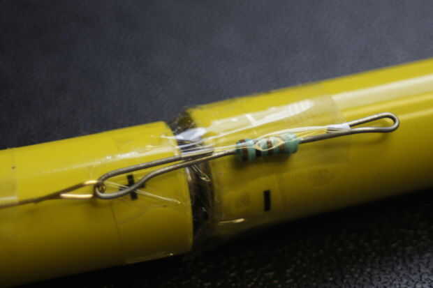 Utilice una resistencia que funciona para tu LED con dos 1,5 V (= 3 V) baterías. Probablemente será un valor bajo.