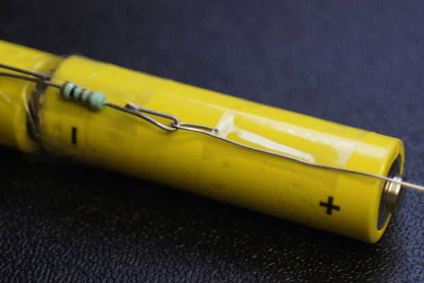 El cable de la resistencia probablemente no es suficiente para alcanzar el lado positivo (+) de la segunda batería. Necesitamos a ad un trozo de alambre para llegar a ella.