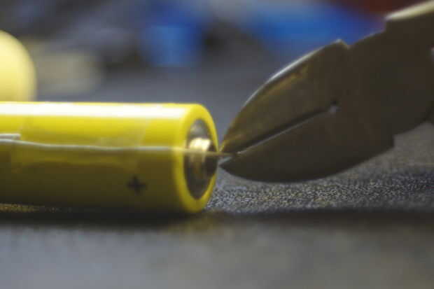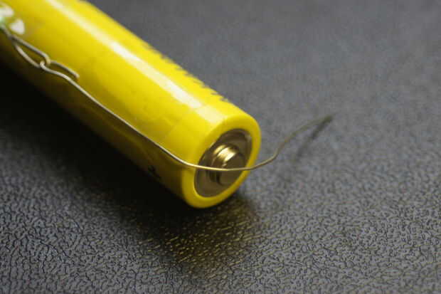 - Doblar el extremo del alambre alrededor del final de la segunda batería por lo que puede tocar el polo positivo (+) de la segunda batería.