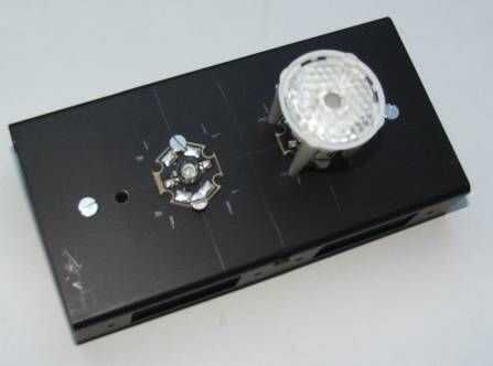 marcar posición de LED y lentes en el disipador térmico y taladrar los agujeros.