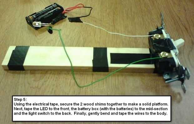 2. Pegue las 3 secciones del circuito para el cuerpo. Sería mejor para el interruptor de la luz hacia abajo, luego la caja de baterías con las baterías, entonces finalmente la luz del LED de la cinta.