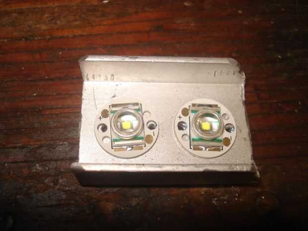 una vez que lo tienes, perforaciones en ella donde desea que el led s para mantener en su lugar. pegote encima de la parte inferior del LED con grasa térmica, pégalos en y entonces les atornille.