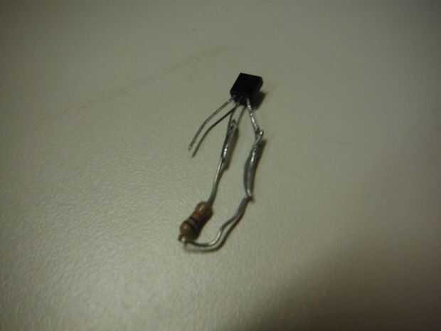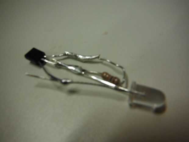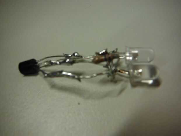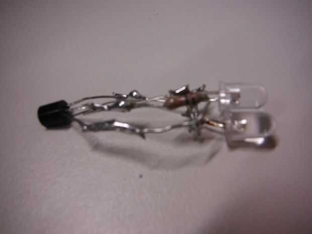 En primer lugar, soldar los extremos de ambos de la resistencia al pin derecho y el pin central del transistor. Entonces, soldadura al transistor de la foto conduce a los pines de la izquierda y mediados. Por último, la soldadura provoca los LED del transistor izquierdo y medio conduce.