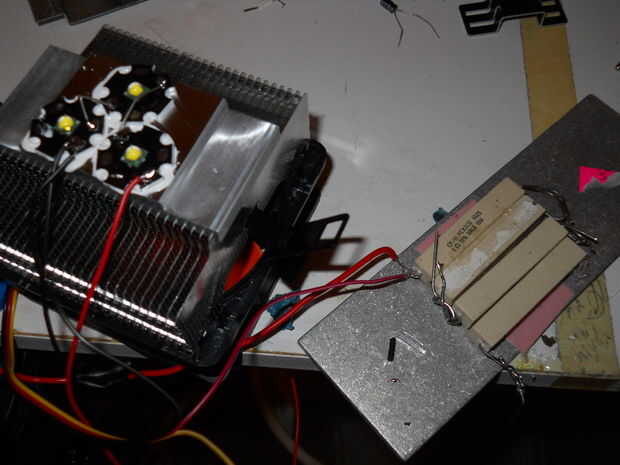 Los LEDs producen mucho calor que debe ser gestionado. Para ello, utilice una cantidad liberal de pasta del disipador de calor y coloque los tres en el centro del disipador. Abrazadera hacia abajo hasta que se seque y no te preocupes si algunos del disipador térmico pegar arroja a chorros hacia fuera los lados, ya que no afectará el rendimiento de la luz, a menos que consiga en la cúpula actual del LED. También necesitará disipador térmico de las resistencias, como corren bastante calientes. Esto no debería ser un problema para ellos, más un problema para los LEDs, ventilador, batería o caja, ya que pueden llegar lo suficientemente calientes como para derretir a cualquiera de los anteriores.