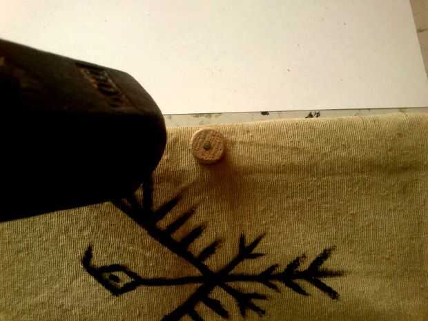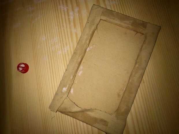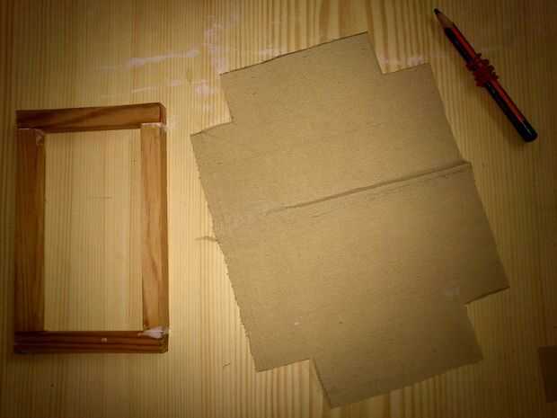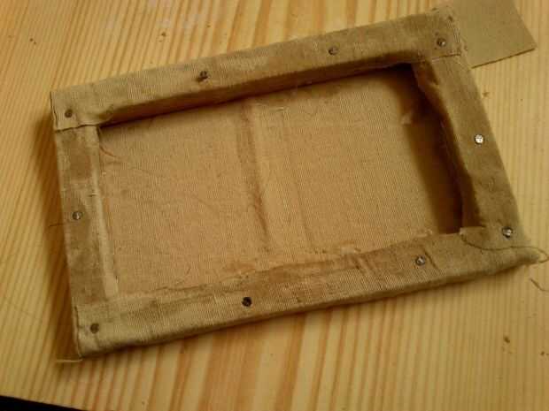 Luego colocar el marco en la tela. Después dibuja la figura para la cubierta y cortar. Otra vez usé pegamento y clavos para fijarlo en el lugar correcto.