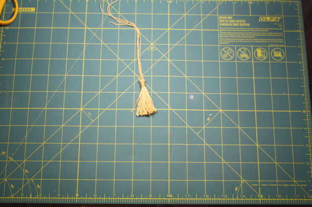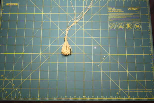 Cortar una hebra más larga (por lo menos 10 pulgadas) y deslícelo por debajo de los hilos envueltos. Haga un par de nudos para unir todos los hilos en la parte superior. Tomar otro filamento largo y unir los hilos de rosca frontales de 1/2" de la parte superior con un enganche de vaca (doblar por la mitad, deslice el lazo bajo, tire de los extremos por el lazo). Ahora es el momento para liberarse de la cartulina. Doble un poco así que usted puede resbalar de la borla. Tomar ese hilo doblado a la vaca enganchado y comenzar enrollándolo alrededor de los hilos de rosca juntos, todavía cerca de 1/2" de la parte superior. Cuando estés satisfecho con la apariencia de la parte superior, ate las hebras por encadenar uno a través de algunos de los pequeños lazos en la parte superior. Si quieres que se vea la mancha, enrosque los extremos por dentro todo eso envoltura que acaba de hacer. Cortar los lazos en la parte inferior y recorte hasta se parece incluso. Tada! Borla!